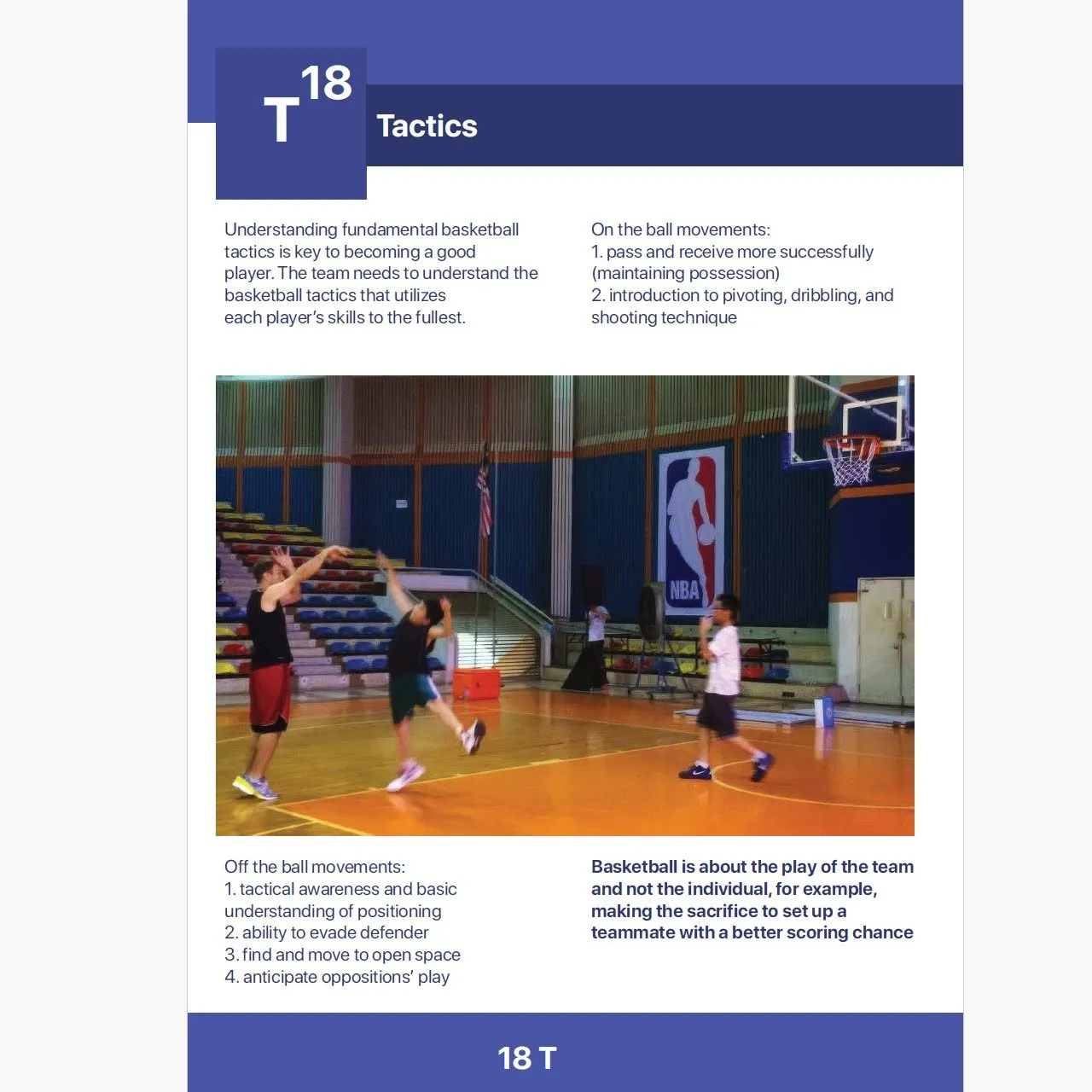 The manual covers essential topics such as safety tips, the significance of basketball, ball handling, control, passing, dribbling, lay-ups, shooting, rebounding, offense, defense, tactics, and performance, all presented in clear and accessible language, complemented by photographs.